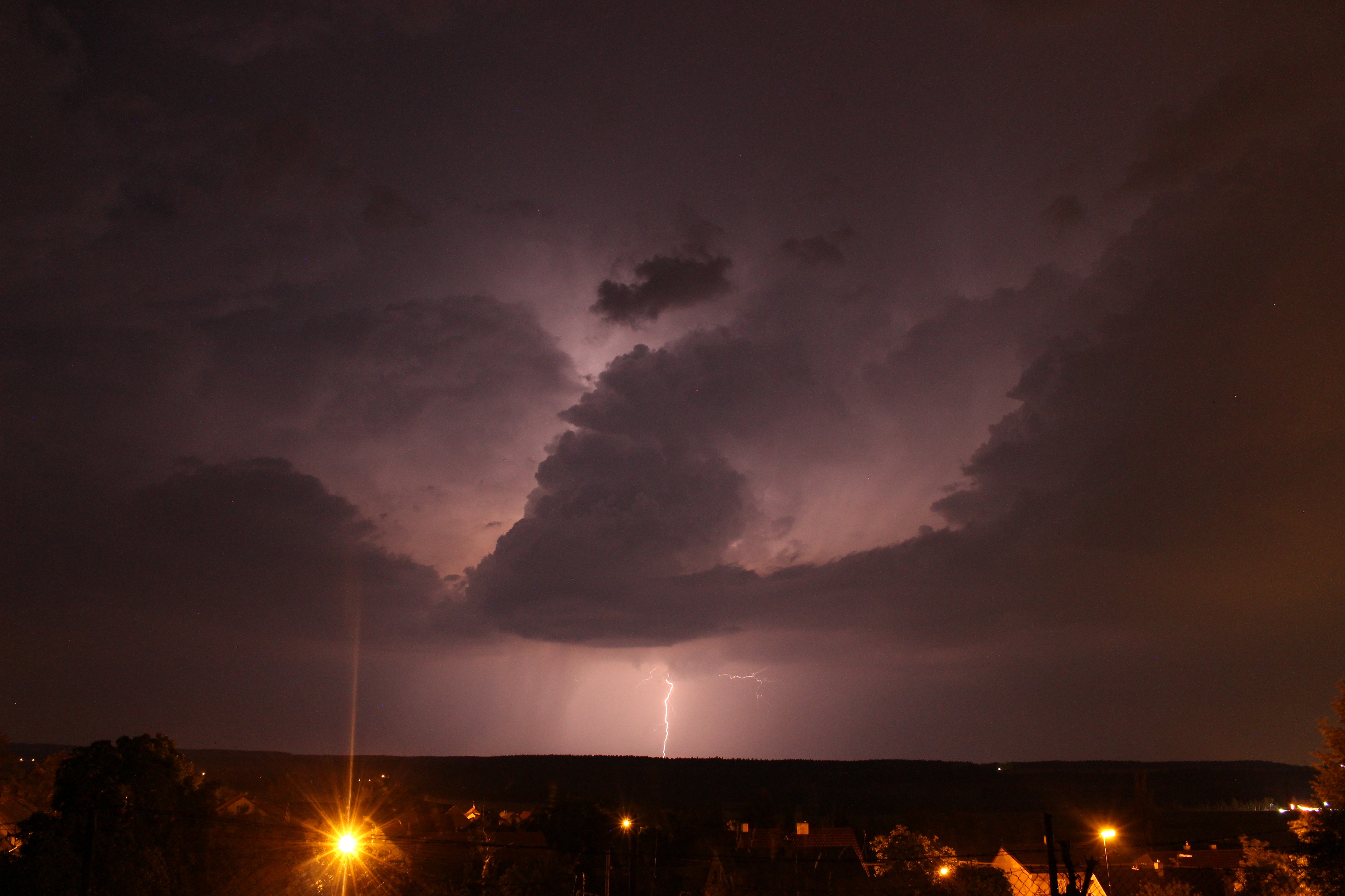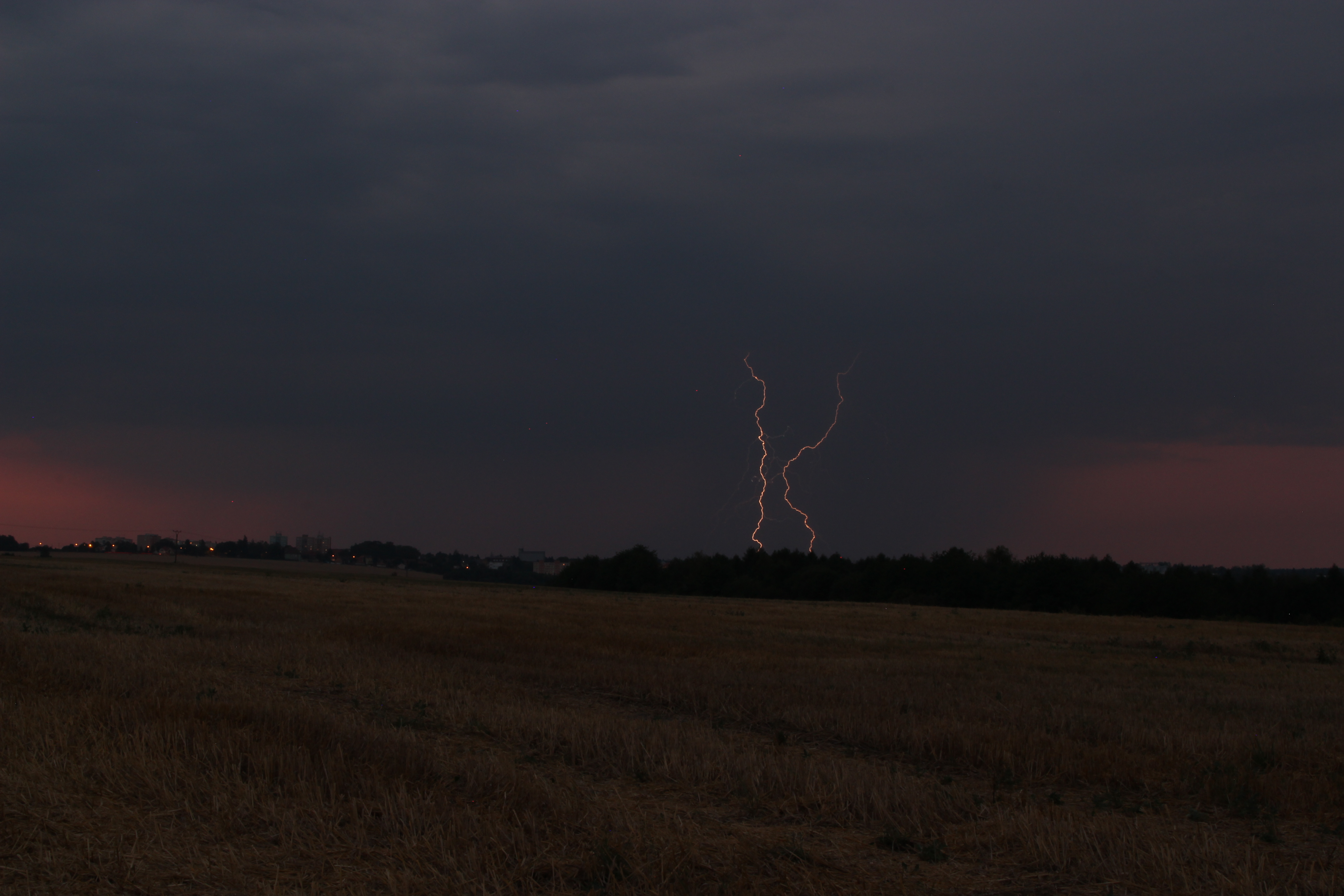 Večer, když už se stmívalo, mě na radaru upoutaly odrazy motající se na čáře cca Louny - Cheb. Zabalil jsem foťák a vyrazil na pole. Okouněl jsem tam minimálně půlhodinu a za tu dobu jsem se dočkal jen několika nesmělých IC, co by se daly spočítat na prstech. "Cože? To je všechno? Vždyť je to bouřka jako prase..." A najednou mě z úvah vytrhlo CGčko. Pohled na radar ukázal, že původní bouřka už skoro zanikla, ale za to se vytvořila, vnořená do okolní oblačnosti, malinká a nečekaně aktivní buňka a ta s frekvencí jednou do minuty začala sypat pěkný a blízký CG. Během čtvrt hodiny bylo po všem, tak jsem se mohl vydat k domovu konečně s pocitem, že nejedu s prázdnou.