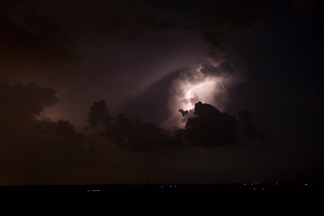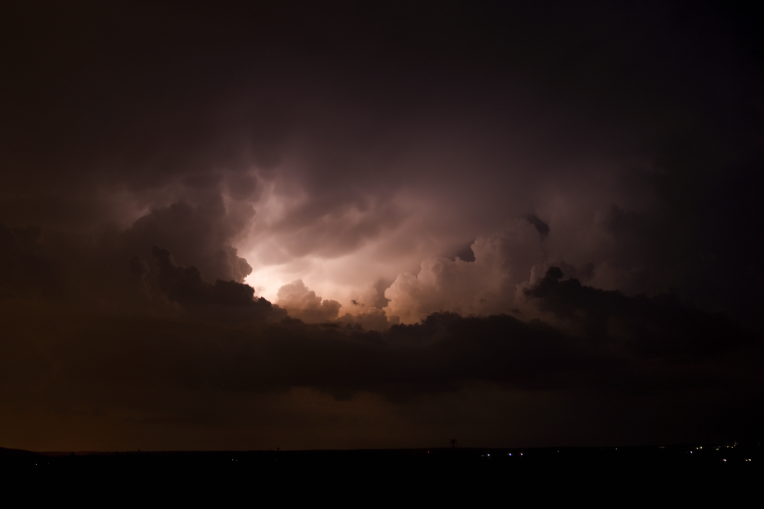 První dějství příšlo už v noci, coby jakýsi pozdní nájezd včerejších slibovaných bouřek. Sice tady nespadla ani kapka, ale na focení dobrý. byly to první letošní noční bouřky - viz foto. Akorát jsem to trochu zaspal, protože jsem nečekal, že předpovědi Aladina, které poslední dobou připomínaly tahání čísel ve sportce, konečně měly nějaký reálný základ. Výsledkem bylo několik pěkných cébáků nasvícených blesky.