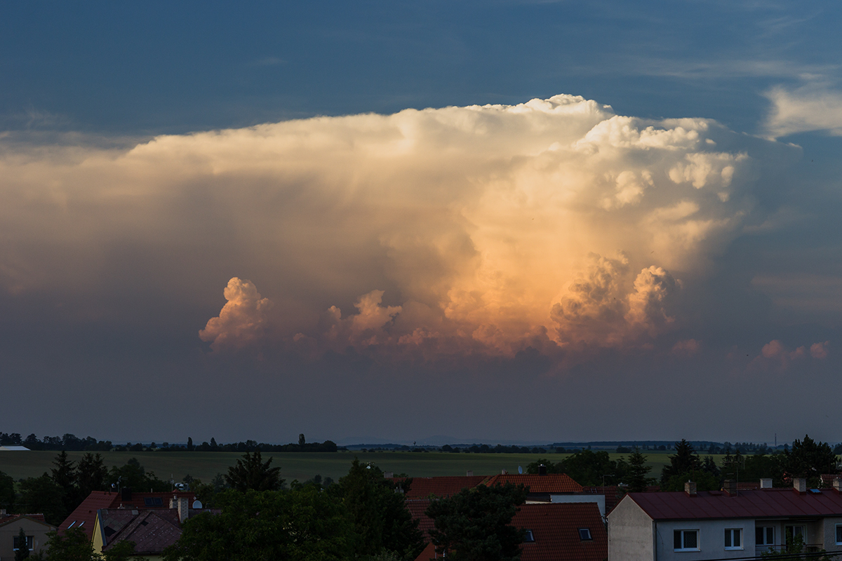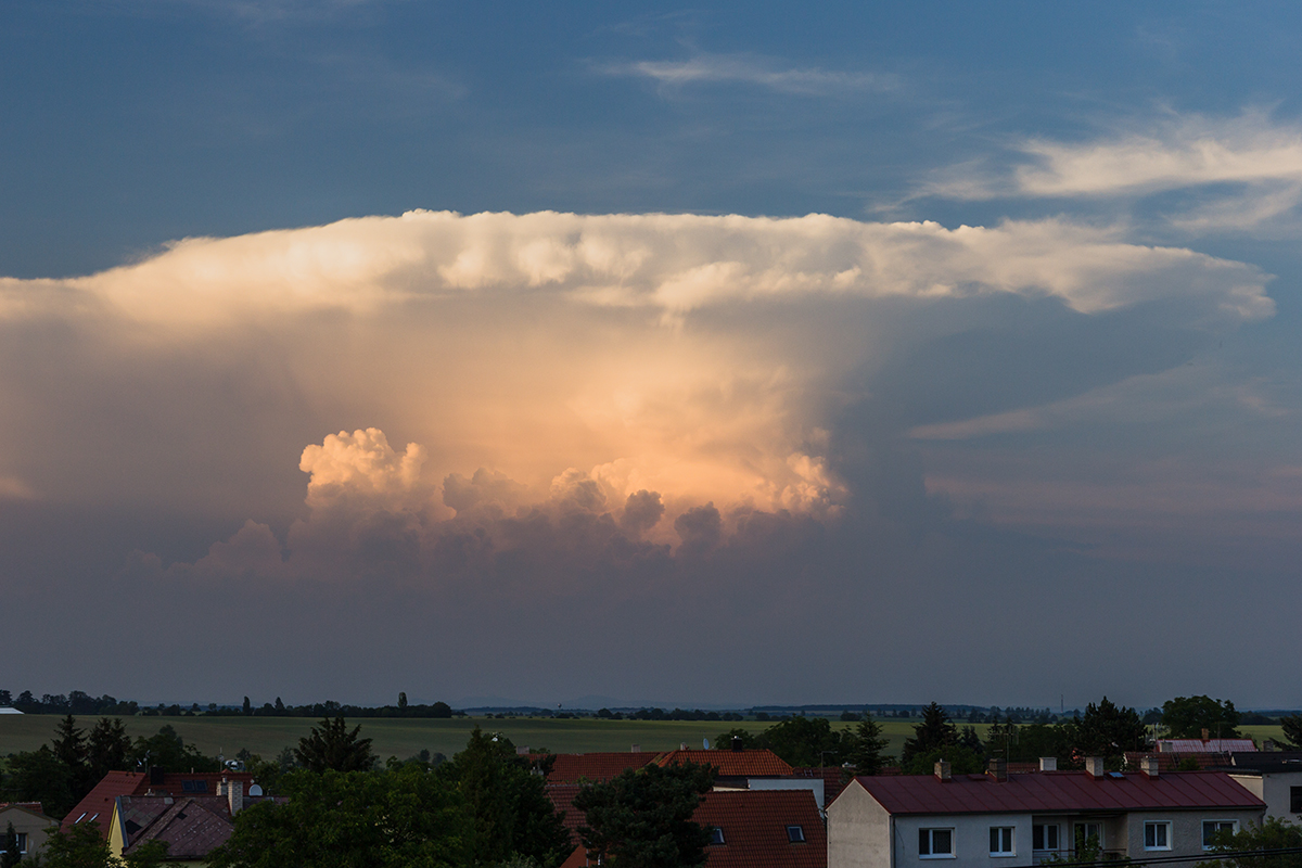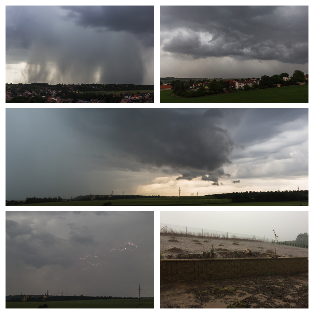 Včera jsem si teda nadělal na hlavu. Noční bouřky jsem sladce prochrápal, odpoledne jsem sice věděl, že se něco chystá, jenže zkouška je zkouška a o příchodu bouřky jsem se dozvěděl, až když nám ve zkušebně v Rynholci do hraní začaly blikat žárovky. Pak už jsem jenom občas vyběhl na verandu se podívat na to nadělení s 5mm kroupama a slejvákem, jakej tady dlouho nebyl. Rozpadající se systém pak k večeru vypustil ještě pár blízkých a pěkných CG a dlouho do noci z něj pršelo.