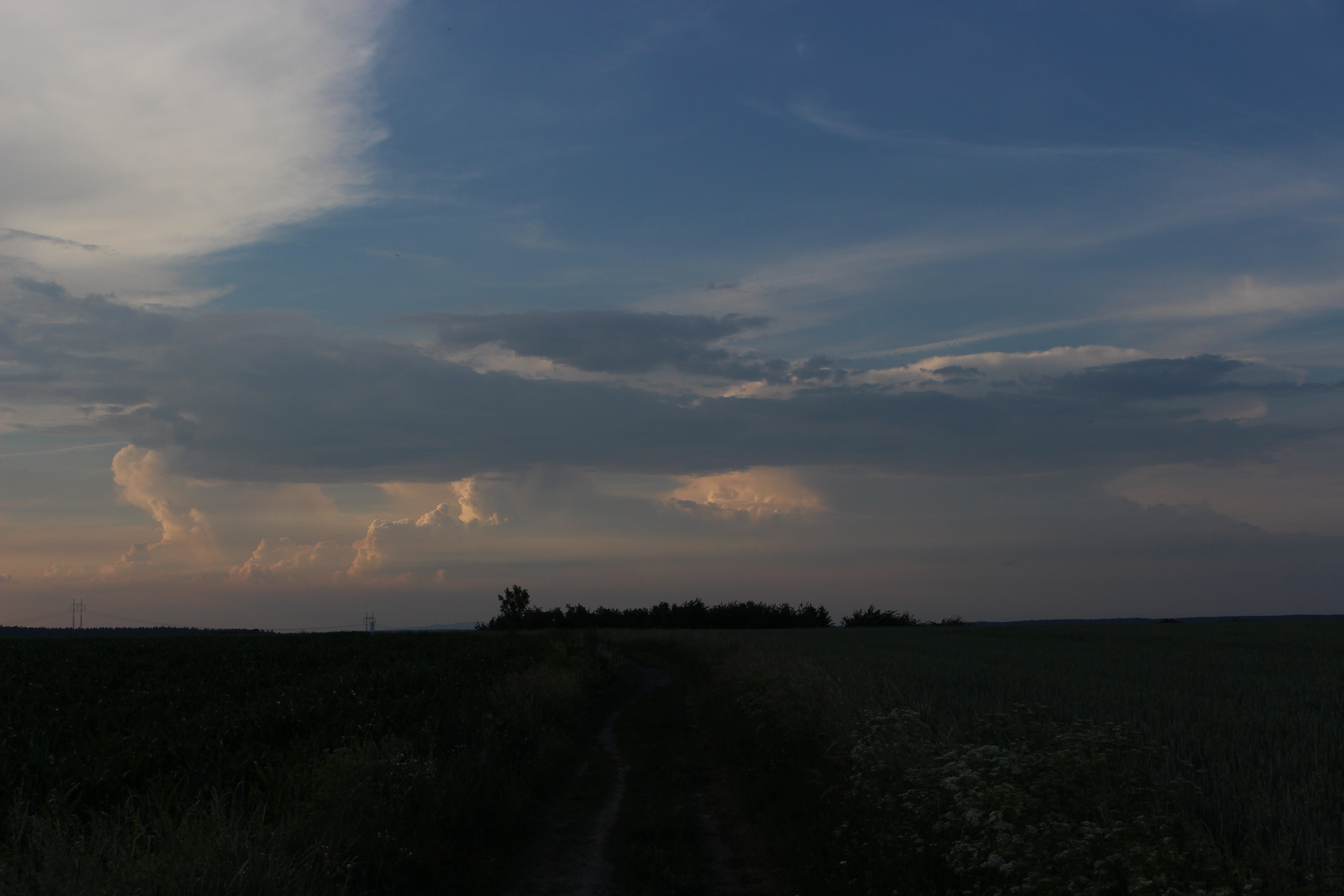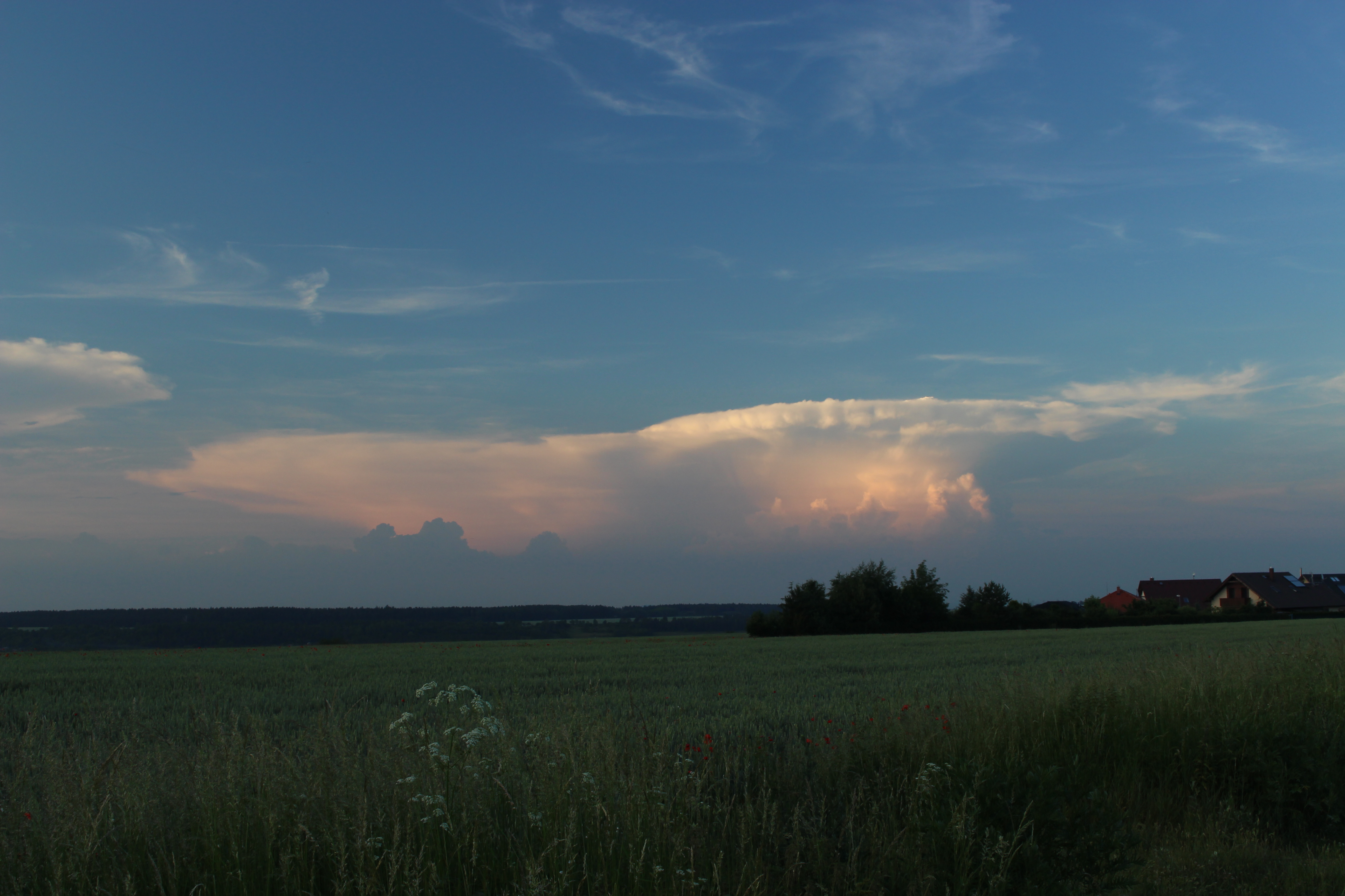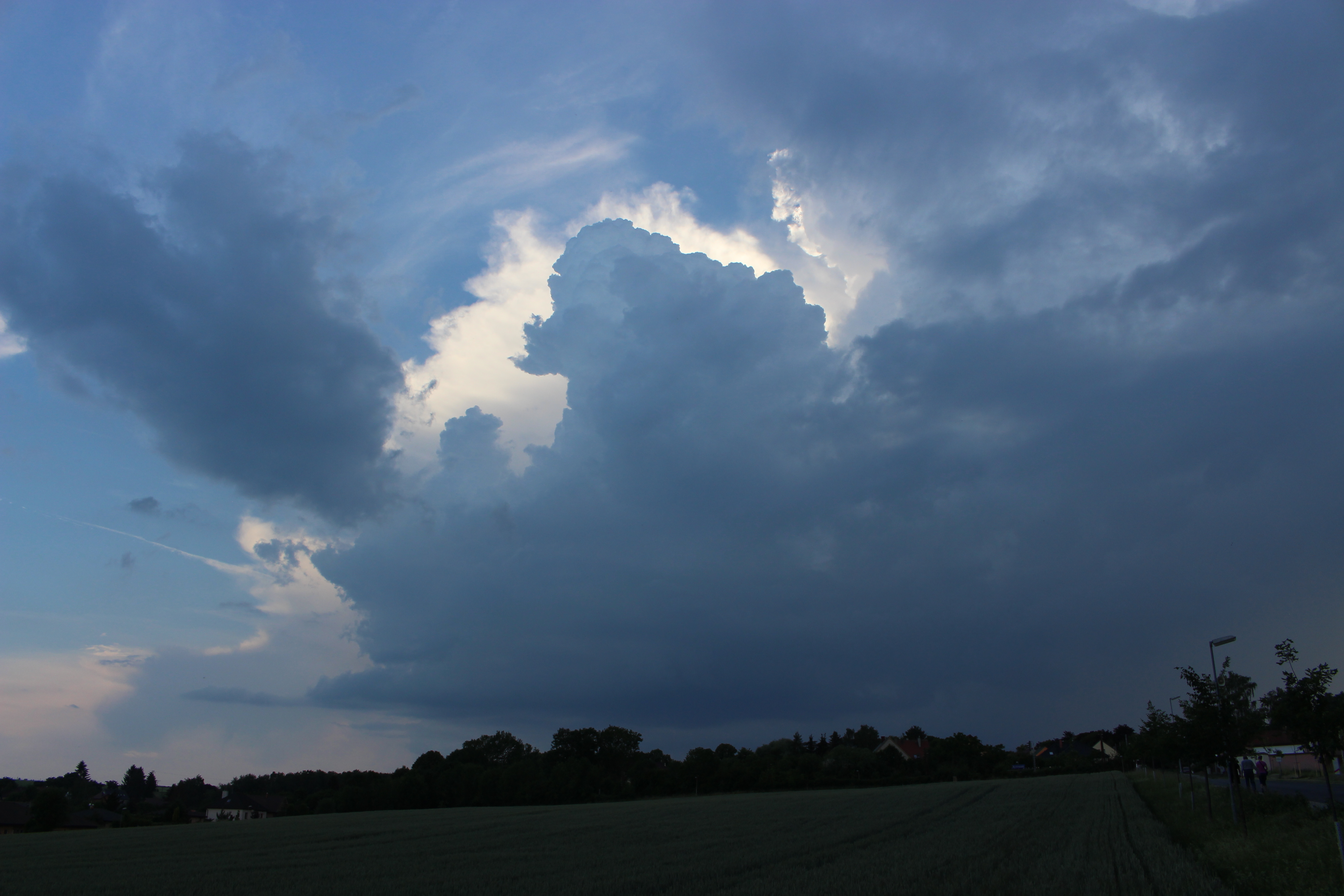 Včera jsem si teda nadělal na hlavu. Noční bouřky jsem sladce prochrápal, odpoledne jsem sice věděl, že se něco chystá, jenže zkouška je zkouška a o příchodu bouřky jsem se dozvěděl, až když nám ve zkušebně v Rynholci do hraní začaly blikat žárovky. Pak už jsem jenom občas vyběhl na verandu se podívat na to nadělení s 5mm kroupama a slejvákem, jakej tady dlouho nebyl. Rozpadající se systém pak k večeru vypustil ještě pár blízkých a pěkných CG a dlouho do noci z něj pršelo.