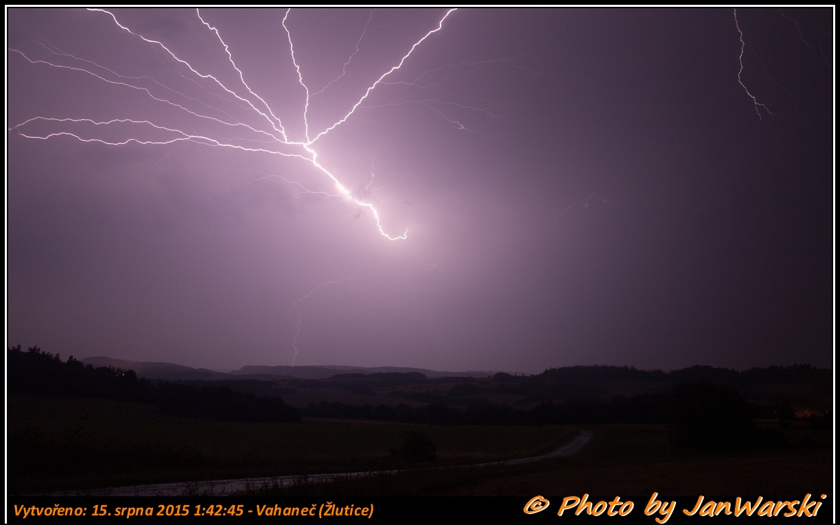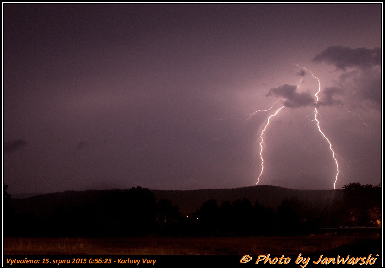 zde mám pár záběrů ze stanoviště Úněšov BČS, kam jsem se vydal jakoby od Plzně a jel jsem po silnici I/20 směrem dál k okresu Tachov, celou dobu jsem se pohyboval v úseku od Horní Bělé až po obec Bezvěrov (okres Plzeň - sever). Po chvíli mého cestování mi to zavedlo do Úněšova, kam jsem neustále bouřku sledoval. Vyrazil jsem 14.8.2015 asi tak cca ve 22.30 hod.SELČ, kdy jsem měl před bouří, která přicházela ze západu od obce Hubenov, náskok asi tak necelou hodinu. Všechno bylo už od odpoledne připravené v autě. Označil jsem si vozidlo a dal na střechu maják, vyrazil jsem do terénu. Nejprve jsem mířil z obce Hubenov více na jih - JZ, kam jsem se dostal až do Pernarce, odtud jsem viděl, jak se bouřka s doprovodnými jevy blíží, nechtěl jsem, aby to přešlo přes mě, tak jsem zvolil ústup a zadem jsem se vrátil do obce Úněšov pod střechu benzínové čerpací stanice. :arrow: Tahle Bouřka postupovala směrem k SZ a další dvě jádra byly mezitím nad obce Záhrádka až Dolní Bělá. Svůj aprát jsem pod střechou BČS namířil směrem na SZ na obec Zahrádka. Přesto jsem zůstal sedět v autě, protože pokud jde bouřka s doprovodnými jevy nad vámi, tak bezpečnosti není níkdy dost. Na několik málo minut mi to rozladilo telefonu, který začal fungovat nestandartně. Tak jsem se dále musel spolehnout na své znalosti. Zde je pár pořízených záběrů, které nejsou tak úplně kvalitní, ale myslím, že z meteorologického hlediska plně dostačující. V příloze je pár těch nejpovedenějších a zejména jsou zde vidět i větvené blesky, které si sáhli až nad kapotu mého vozidla.