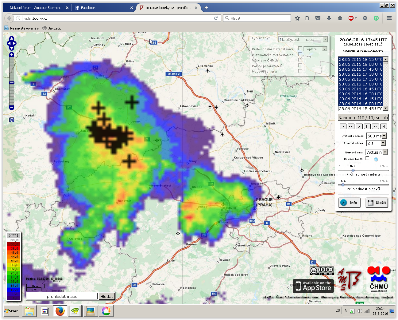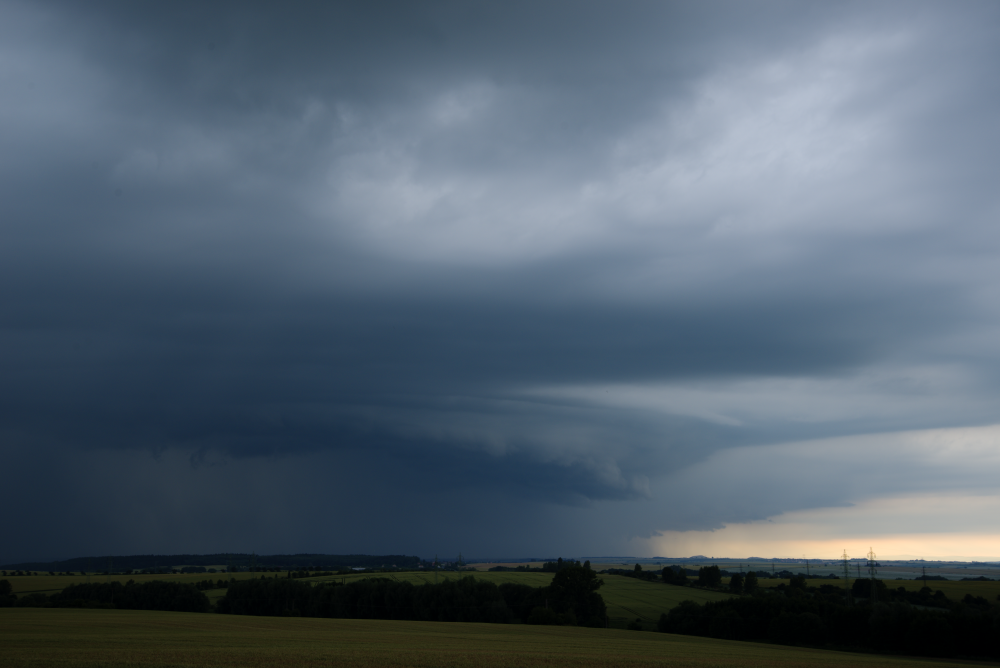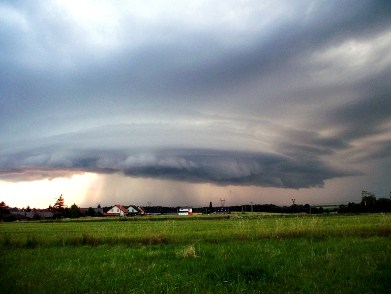 V 19:45 SELČ, když jsem se vracel z práce, dorazila od západu na Stochov takováhle nádhera. Na severu, kde byla bouřka nejsilnější, byla jen černota, ale jižní, rozpadající se křídlo bylo parádní. Za těch deset minut asi pět zahřmění, v 19:55 mě vyprovodil zpátky náraz větru ze směru postupu bouřky a spíš mrholení, než déšť. Teď, ve 20:30 SELČ, už neprší. Tohle můžu