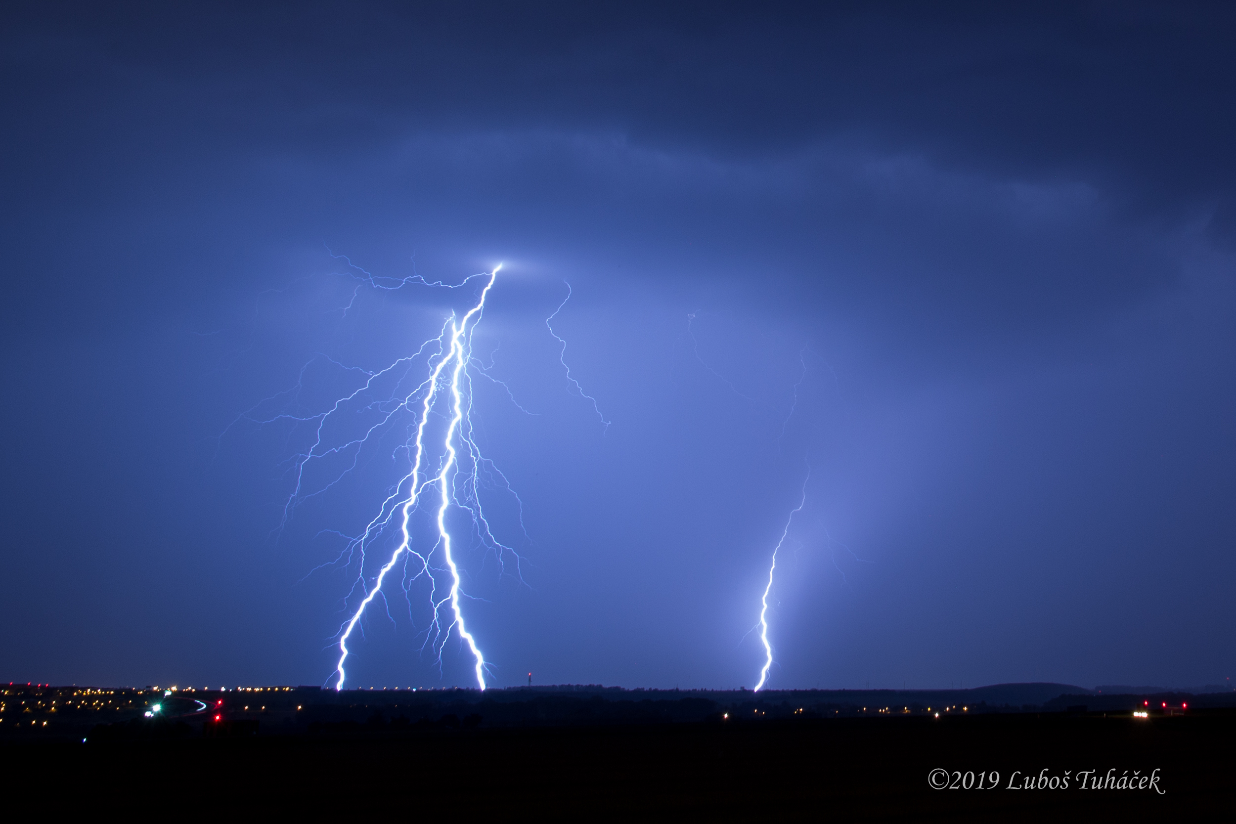 Včera (nebo dneska) se to povedlo. Proti všemu očekávání dorazila MCS ve zdraví až sem v záplavě blesků, a protože šla lehce okolo, tak jen s průměrným deštěm a téměř při bezvětří. Ve 23:00 SELČ jsem vyrazil z baráku, a už po cestě na oblíbenou hromadu štěrku u Rynholce bylo jasný, že tohle nebude jen tak. Co dvě vteřiny záblesk přes půl oblohy, a když už se začaly ukazovat kanály blesků, začalo pršet. To jsem nadával, ale po cestě zpátky se ukázalo, že pod skupinou nízkých stromků blíž ke Stochovu neprší, tak jsem se tam utábořil (vím, neměl bych, ale žízeň je veliká... :) ) a fotil a fotil, dokud mě pud sebezáchovy nezahnal definitivně domů. Zážitek mi ještě zpestřovaly sice sporadicky, ale o to blíž z kovadliny bouchající CG na severu. Ty jsem skoro obrečel, jenže to byla záležitost tak náhodná, že nemělo cenu tím ztrácet čas. Asi do 1:30 SELČ jsem ještě koukal z okna na obří blesky (anvil crawlery, snad i pár CG+) na zadní straně bouřky, než se ta dostala ku Praze a začala definitivně slábnout.